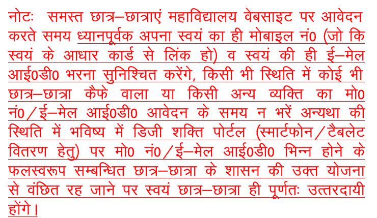 अभ्यर्थी द्वारा महाविद्यालय की वेबसाइट पर अपना ऑनलाइन आवेदन के उपरांत मेरिट सूची में नाम आने के उपरांत अपने समस्त मूल प्रमाण पत्रों के साथ महाविद्यालय द्वारा निर्गत तिथि को महाविद्यालय में प्रवेश समिति के समक्ष उपस्थित होना अनिवार्य होगा भारांक आदि संबंधी मूल प्रमाण पत्र भी प्रस्तुत करना अनिवार्य होगा मूल प्रमाण पत्रों के अभाव में प्रवेश मान्य नहीं होगा |